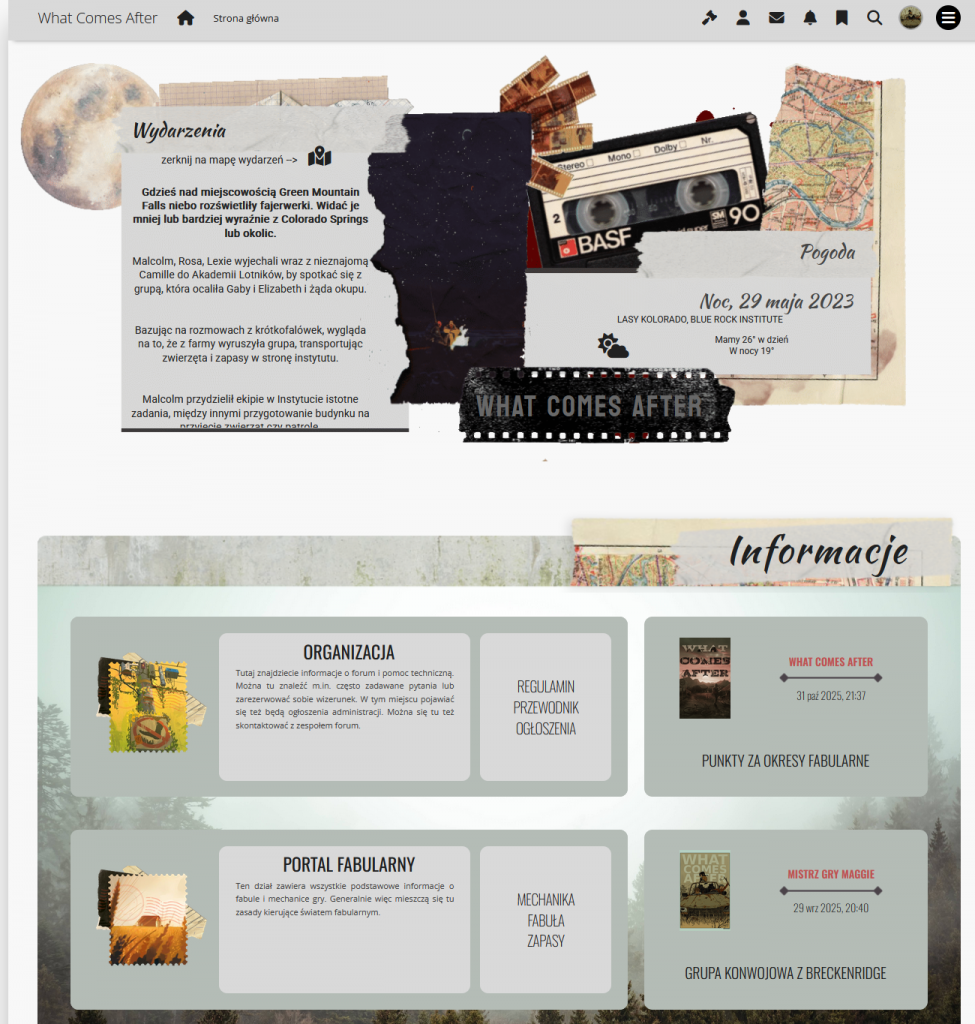 What Comes After is a long-running, text-based Forum RPG set in a post-apocalyptic world after a sudden zombie outbreak in Colorado. It’s a persistent, forum-based experience focused on survival, logistics, and relationships between characters. Players manage resources, negotiate with other survivor groups, and deal with the emotional fallout of a collapsed society.